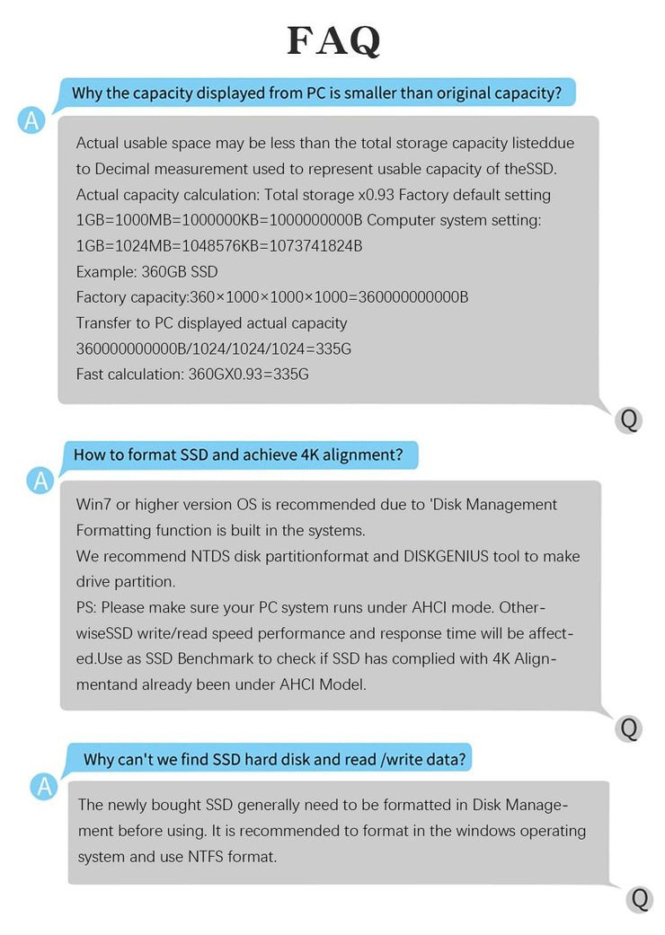 Before you use it please right click "My computer-Management-Device manager-disc drive" and can find our SSD. Please do the format and partition.